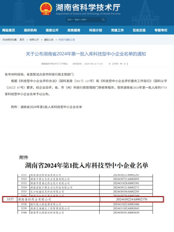 經(jīng)過市、省科技行政管理部門的嚴格審核,湖南省科技廳發(fā)布了《關于公布湖南省2024年第一批入庫科技型中小企業(yè)名單的通知》,湖南泰陽藥業(yè)有限公司被認定為“國家級科技型中小企業(yè)”。